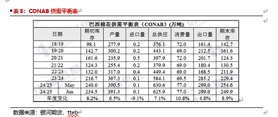 据巴西国家商品供应公司(CONAB)6月份发布的2024/25年度最新产量预测数据:本年度巴西棉花总产预期为391.3万吨,较上一月调增0.8万吨。本年度种植面积下调至208.15万公顷,单产上调至125.3公斤/亩。Conab小幅上调巴西棉产量评估,但种植面积下调。不过由于23/24年度陈花销售较好,下调了24/25年度期初库存,因此期末库存评估下调。