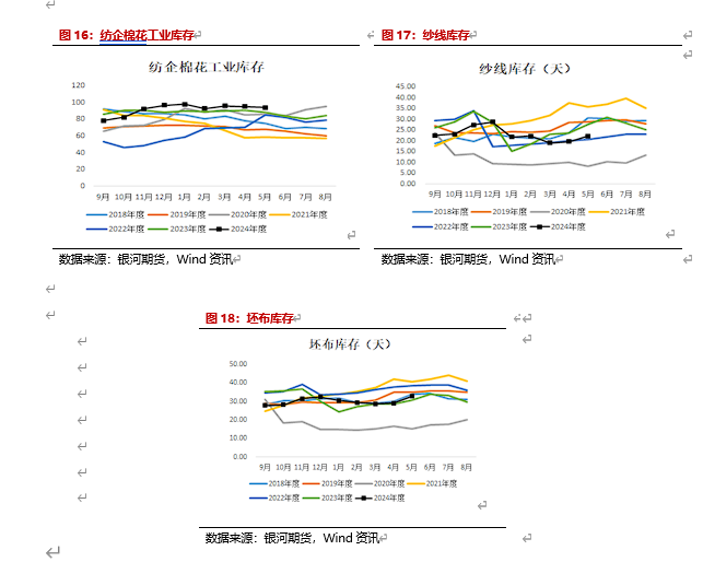 下游库存方面,目前处于季节性淡季,目前工业库存仍处于高位,下游纱线、坯布库存有小幅累库的情况。根据中国棉花信息网最新数据,6月中旬我国工业库存为93.01万吨,纱线库存为23.86天,较半月前增加1.52天、坯布库存为35.46天,较半月前增加2.57天。