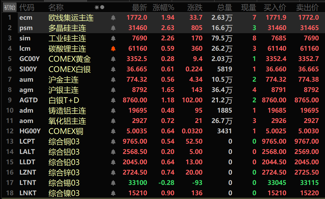 此外,铸造铝主连期货涨0.48%,氧化铝主连涨0.72%。碳酸锂涨0.59%,工业硅涨2.26%,多晶硅涨2.63%。