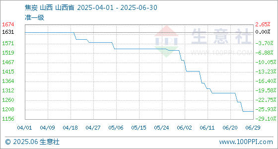 6月30日,生意社焦炭基准价为1200.00元/吨,与本月初(1533.33元/吨)相比,下降了21.74%。