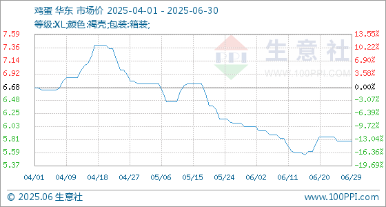 6月30日,生意社鸡蛋基准价为5.78元/公斤,与本月初(6.03元/公斤)相比,下降了4.15%。