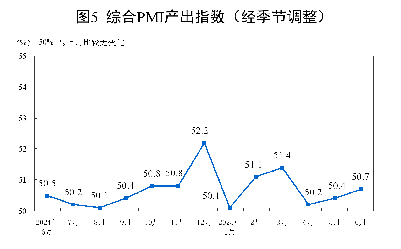 6月份,综合PMI产出指数为50.7%,比上月上升0.3个百分点,表明我国企业生产经营活动总体扩张有所加快。