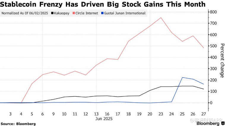 与稳定币相关的股票涨势正在全球市场蔓延,促使Kakaopay的母公司Kakao及其竞争对手Nave的股价上涨。在美国,Coinbase(COIN.US)等Circle同行的股价也出现上涨。