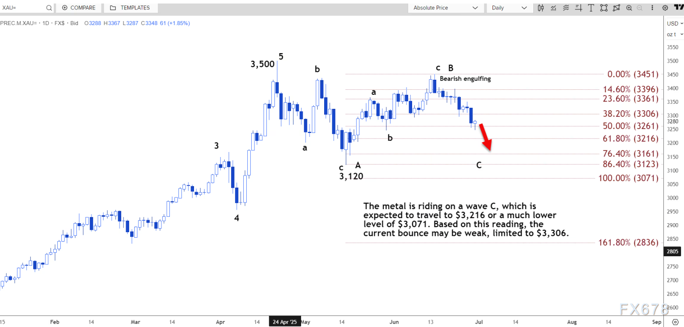 日线图上,金价正处于C浪走势,预计将跌至3216美元或更低的3071美元水平。基于此,当前反弹可能较弱,仅限于3306美元。