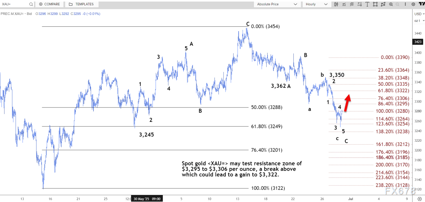路透技术分析师指出,现货黄金可能测试每盎司 3295 美元至 3306 美元的阻力区,突破该阻力区则可能上涨至 3322 美元。
