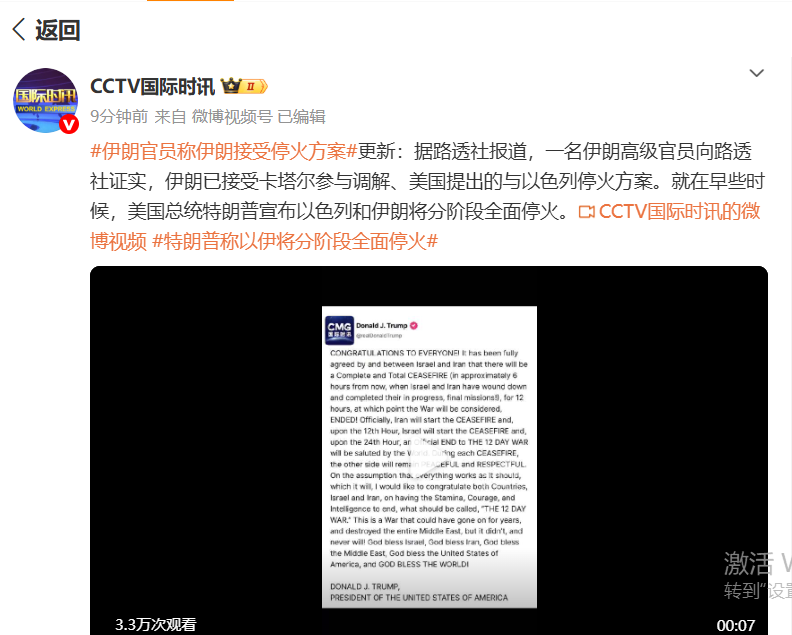 据央视新闻,当地时间6月23日,美国总统特朗普在其社交媒体平台“真实社交”上发文表示,以色列和伊朗已同意全面停火。