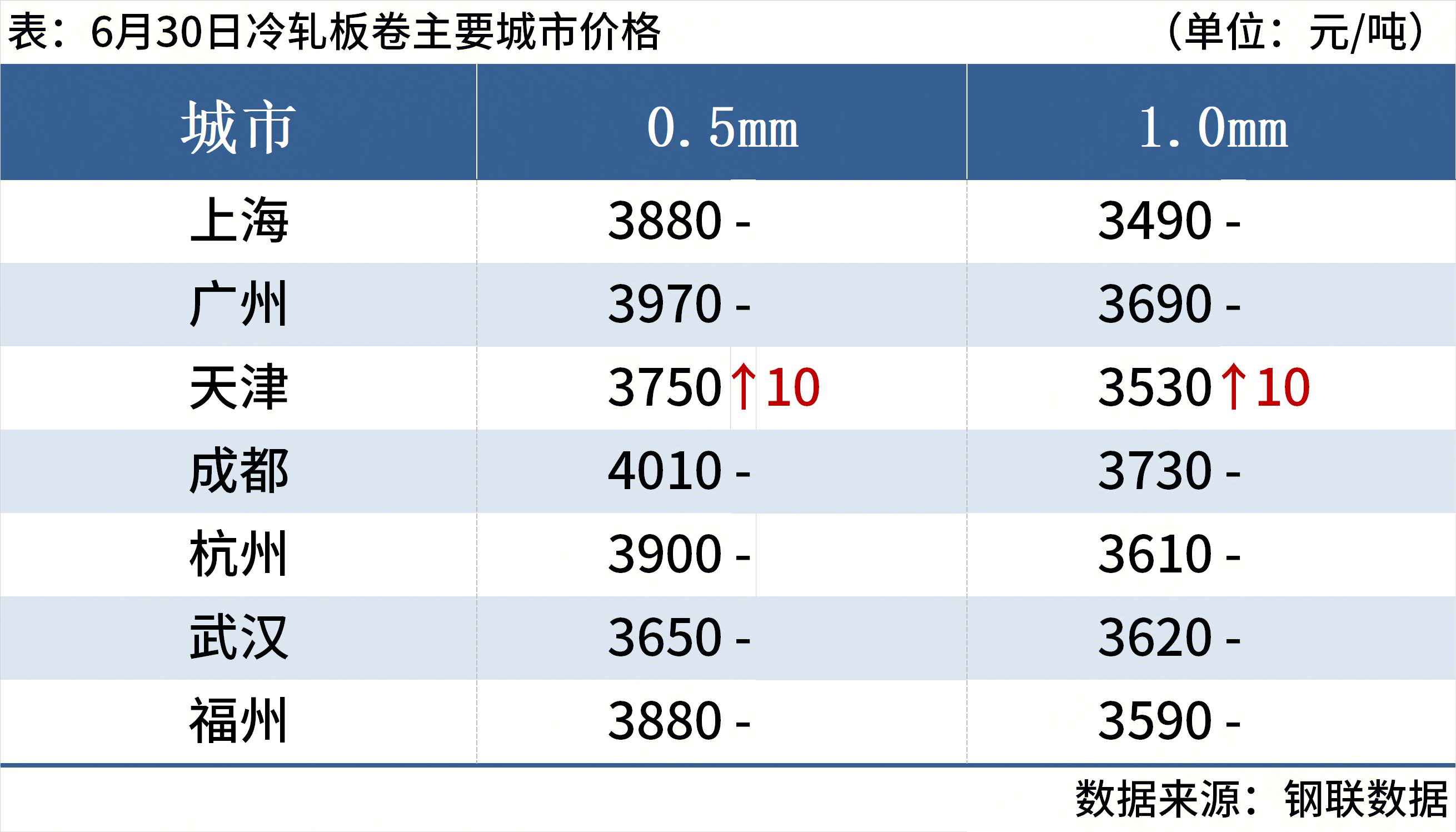 冷轧板卷:6月30日,全国24个主要城市1.0mm冷卷均价3692元/吨,较上一交易日下跌1元/吨。据贸易商反馈,当前市场观望情绪浓厚,淡季的销售压力逐步增加,实际成交未有起色。在供应端未明显减量的情况下,库存去化速度缓慢。6月最后一个交易日,商家在报价基础上,议价空间有所增加,整体操作以成交回款为主。心态方面,当前现货市场需求表现不佳,商家为规避风险,7月订货量谨慎。综合来看,预计7月1日全国冷轧板卷现货价格或将弱稳运行。