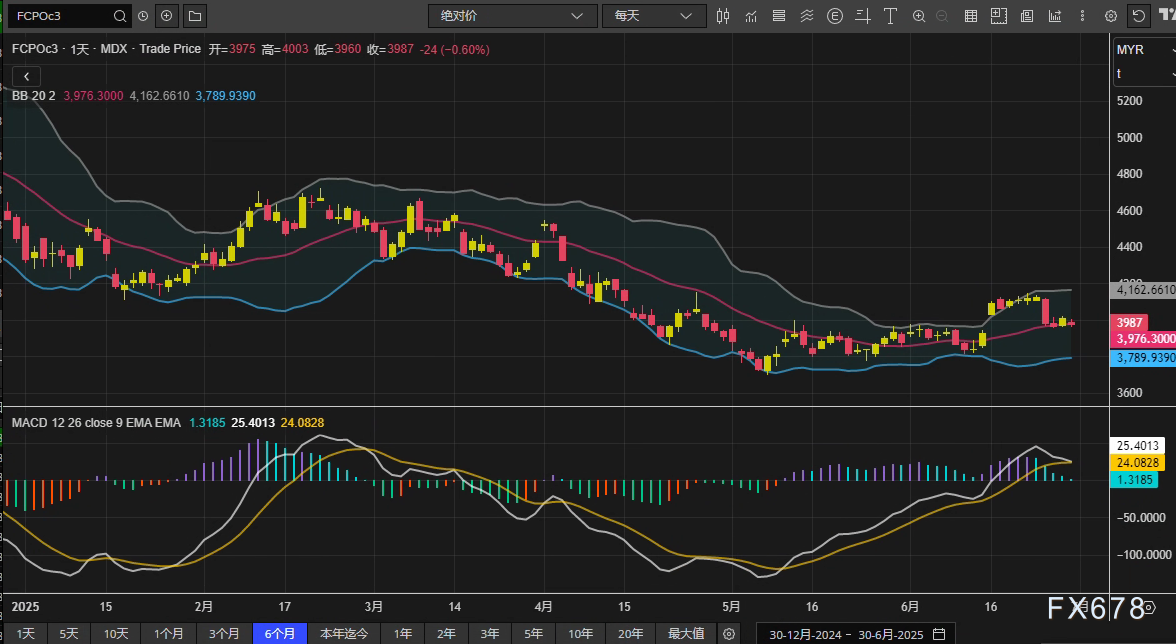 汇通财经APP讯——周一(6月30日,马来西亚衍生品交易所(BMD)棕榈油主力合约FCPOc3收报3987林吉特/吨,日内下跌24林吉特(0.6%),未能延续前一交易日的反弹。技术指标显示,布林通道中轨位于3976林吉特,MACD柱状线收窄至1.32,暗示短期动能有所减弱。市场疲软主要受大连棕榈油及国际原油价格走低的双重压制,而林吉特兑美元升值0.38%进一步削弱了买家意愿。