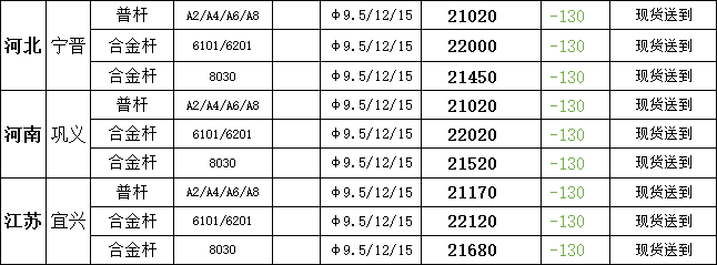 6月30日宁晋市场普铝杆现货报盘价21020元/吨,较上一交易日报价跌130元/吨;巩义市场普铝杆现货报盘价21020元/吨,较上一交易日报价跌130元/吨;宜兴市场普铝杆报盘价21170元/吨,较上一交易日报价跌130元/吨。
