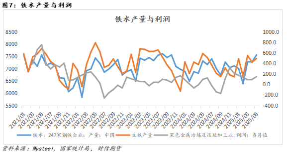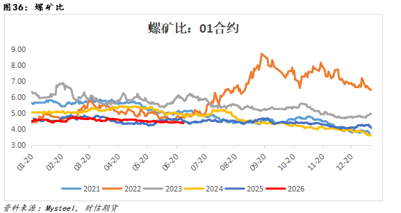 从比值来看,螺矿比整体处于近6同期偏低水平。25年铁矿整体处于强现实弱预期格局,螺矿比上行需看到铁水产量大幅下降,后期重点关注粗钢调控背景下做多螺矿比交易机会(或在四季度)。