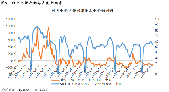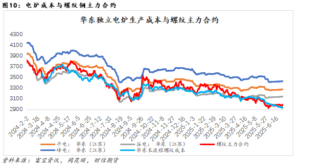 独立电炉方面,建材需求偏弱,独立利润利润承压,产能未能充分释放。据Mysteel调研,1-6月,90家独立电炉周均产能利用率为46.89%,相比去年同期的49.87%略有下降,距离2023年底67%的高位水平仍有较大差距。电炉炼钢是未来的发展方向,但电炉成本相较长流程钢厂暂无优势,建材需求下滑背景下,独立电炉谷电成本成为螺纹钢主力合约压力位所在(目前华东独立电炉谷电成本在3140元/吨左右)。