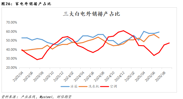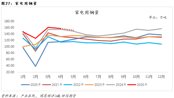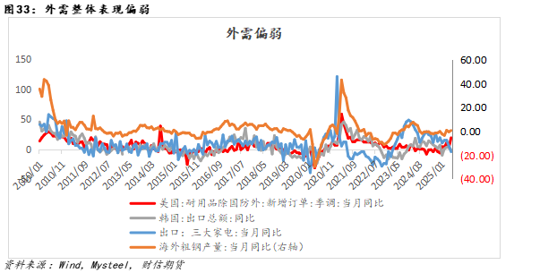 从外需角度来看,外需结构性矛盾显现。制造业被动补库受高利率压制,力度有限且存转向主动去库风险(5月耐用品订单跳涨至19.02%,主因关税窗口期抢进口,非真实需求改善),美国“补库”或较为脆弱;韩国5月出口同比降1.3%,我国三大白电出口同比降4.42%,印证外需疲软本质,亚洲出口链有所承压;关税扰动(如6月钢铝衍生品50%关税)叠加需求背离,出口下行通道尚未逆转,钢材间接出口压力未消。