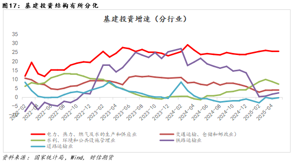 土地出让持续下滑、地方政府化债背景下,基建投资结构有所分化。表现为电力投资维持高增长,传统铁路、道路投资增速偏低。后续重点关注专项债发行再提速后基建项目资金是否明显改善。
