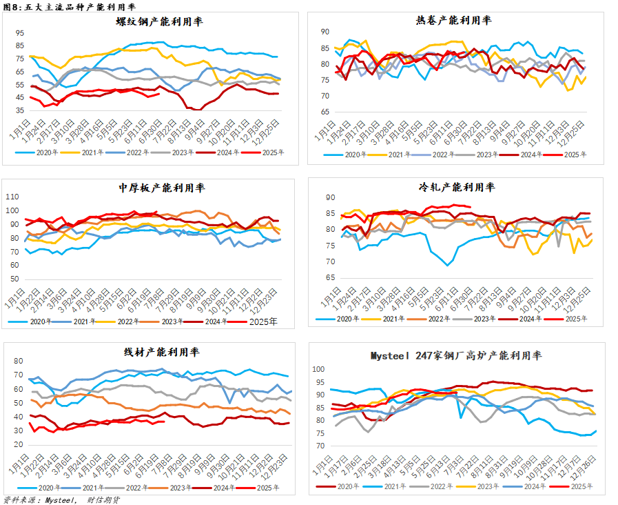 钢厂利润较好,主动减产意愿不足,通过调产,优化产品结构能力进一步增强。据Mysteel,截至6月下旬,247家样本钢厂日均铁水产量为236.39万吨,相比24年同期的228.1万吨增加3.63%。分品种来看,以螺纹、线材为代表的建材受地产下行影响,产能利用率维持低位,以热轧板卷、冷轧板卷、中厚板为代表的板材产能利用率维持高位,品种产量表现分化,或预示钢厂调产能力进一步增强。据测算,截止6月底,25年以来螺纹钢、线材、热轧板卷、冷轧板卷、中厚板周均产能利用率分别为46.62%、34.35%、81.62%、85.41%、94.91%,较24年同期的48.81%、37.85%、81.02%、83.75%、93.02%分别-2.19%、-3.49%、+0.6%、+1.66%、+1.89%。