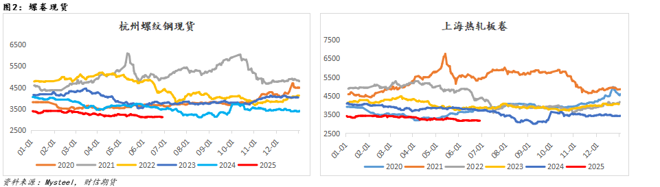 回顾上半年,以螺纹钢为代表的钢材价格弱势尽显,整体呈Z字型走势。截止6月27日,螺纹钢加权价格指数由2024年底的3305元/吨下降至2993元/吨,跌幅为9.44%(略低于24年同时段11%的降幅);现货方面,受需求有韧性,低库存显支撑影响,现货跌幅小于期货,以杭州螺纹现货为例,同时段现货由24年底的3400元/的跌至6月27日的3130元/吨,跌幅在7.94%;热卷由3430元/吨跌至3190元/吨,跌幅在6.99%。分阶段来看: