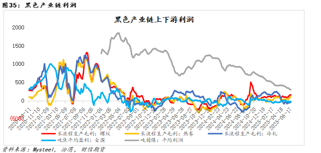 2月下旬至5月底,钢材价格弱势运行,主因在于节后下游需求释放偏弱、全球关税冲击与成本支撑偏弱。美国对华钢铝加征25%关税(3月生效),叠加越南、韩国等对我国板材反倾销,需求偏弱预期压制盘面,4月初中美互征34%“对等关税”,市场恐慌情绪蔓延,工业品集体承压。产业链利润方面,原料炼焦煤受供应宽松,黑链整体处于下游向上游要利润状态,成本支撑较弱。