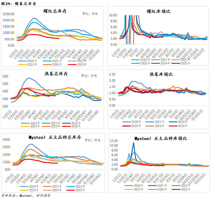 钢材绝对库存尚处低位,库销比亦维持偏低水平,钢材供需面较为健康。2025年建材延续供需双弱,板材延续供需双强。后期重点关注淡季下库存累积速度。