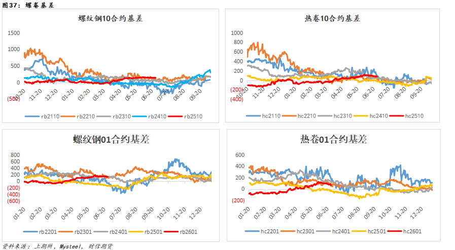 从基差角度来看,螺卷10、01合约基差整体处于中性水平。从现实角度来看,钢材现实需求尚显韧性,低库存背景下有支撑,但淡季需求将进一步走弱较为确定。从预期角度来看,远月有粗钢调控及补库预期,这也是近期螺卷10-1走弱的驱动所在。