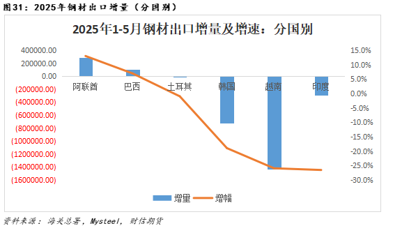 钢材出口韧性超预期,结构优化支撑高位延续。据海关总署数据,5月钢材出口量为1057.8万吨(同比+0.1%),1-5月钢材累计出口量为4846.9万吨(同比+8.9%),显著高于市场预期;从我国钢材出口目的地来看,92.2%的增量来自新兴市场(非洲/拉美/南美),替代传统转口贸易国份额(对越南/韩国/印度出口下降),区域结构升级;从钢材出口结构来看,钢坯出口成为新增长点,反映加工环节外移趋势,产品升级有所突破。