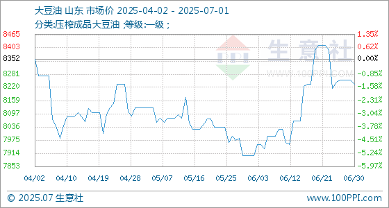 7月1日,生意社大豆油基准价为8234.00元/吨,与上月初(7904.00元/吨)相比,上涨了4.18%。