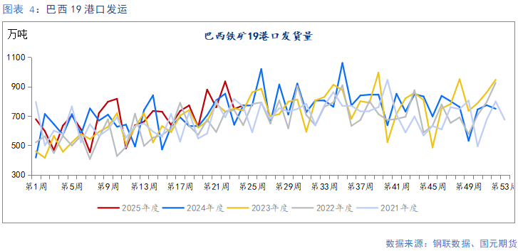 上周,全球发运量为3352.7万吨,周环比下降4.49%。其中,澳大利亚19港口发运1993.6万吨,周环比下降4.78%;巴西19港口发运772.6万吨,周环比增加3.59%。从矿山发运来看,FMG当周发运量为458.1万吨,周环比下降5.16%;BHP当周发运量为574.1万吨,周环比下降19.76%;力拓当周发运量为690.2万吨,周环比增加11.34%;淡水河谷当周发运量为570.4万吨,周环比增加17.37%。