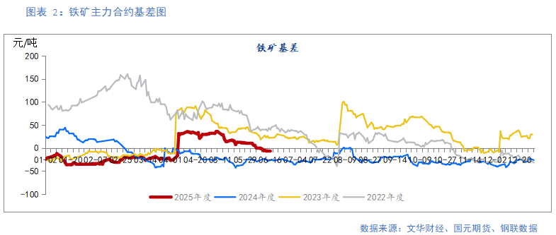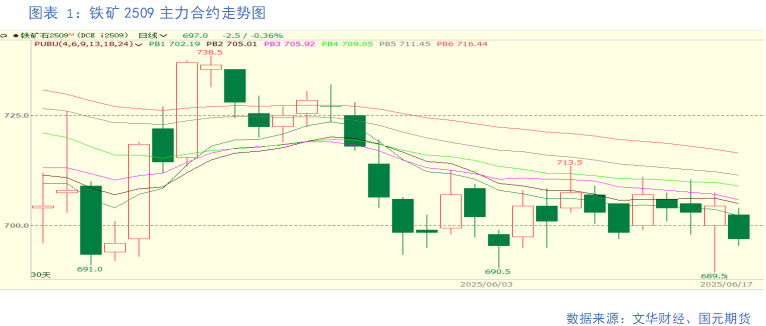 上周铁矿主力合约收盘价为703.0元/吨,上一周周均价为703元/吨,周环比增加0.14%。铁矿价格窄幅震荡,期现基差收缩。铁水降幅收窄,维持在240万吨/天高位,给予铁矿价格一定支撑。