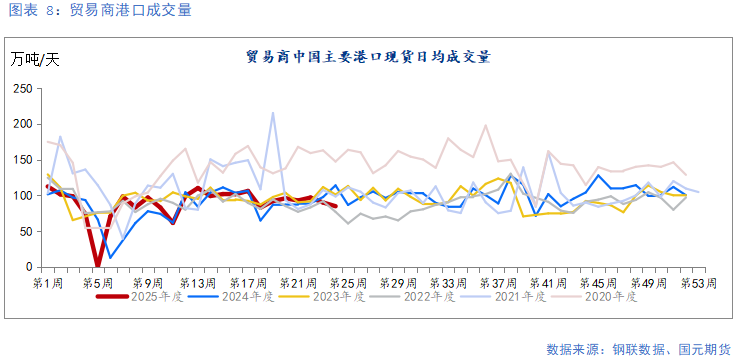 上周,贸易商中国主要港口现货日均成交量为84.8万吨/天,周环比下降5.78%;远期现货日均成交量113.5万吨/天,周环比下降8.17%。