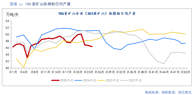 上周,186家矿山企业(363座矿山)铁精粉当周日均产量为46.36万吨/天,周环比下降0.73%。