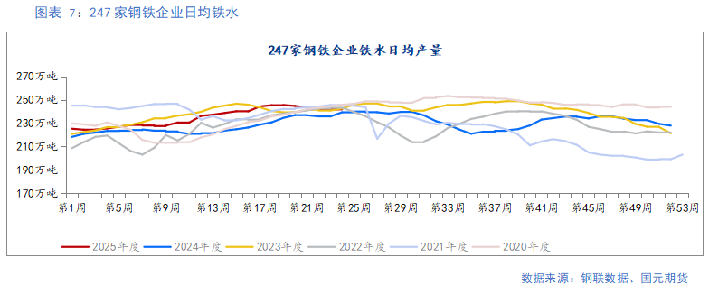 上周,247家样本钢厂盈利率58.44%,较上周下降0.43个百分点;247家样本钢厂高炉开工率为83.41%,较上周持平;247家样本钢厂铁水日均产量241.61万吨/天,较上周下降0.08%。