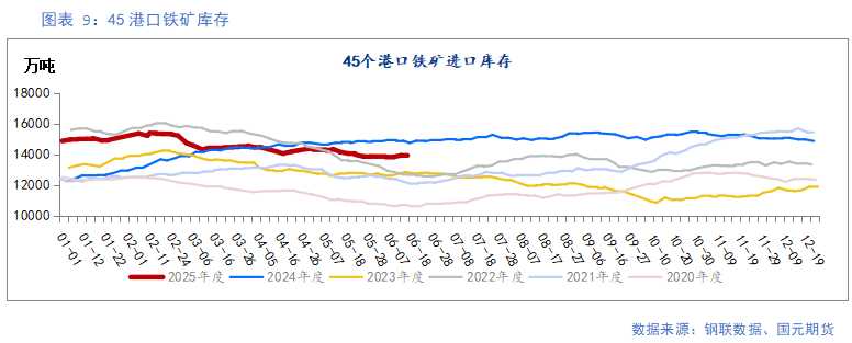 上周,247家钢厂铁矿库存为8798.68万吨,周环比增加1.25%。45港口铁矿库存为13933.14万吨,周环比增加0.77%;其中,澳矿港口库存为6005.96万吨,周环比增加1.58%;巴西矿港口库存为5068.14万吨,周环比下降0.48%。186家矿山企业(363座矿山)铁精粉库存为102.33万吨,周环比下降3.73%。114家钢厂铁矿库存平均可用天数为23.34天,周环比增加1.28天。