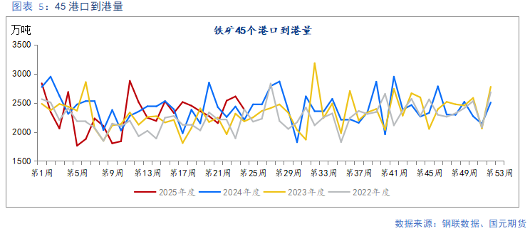 上周,45港口当周到港量2384.5万吨,周环比下降8.62%。