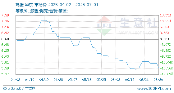 7月1日,生意社鸡蛋基准价为5.62元/公斤,与上月初(6.03元/公斤)相比,下降了6.8%。