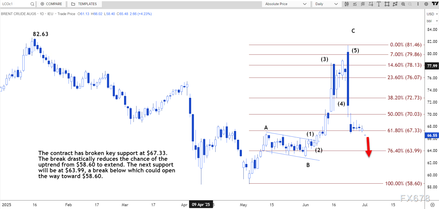 若突破66.94美元,则可能上涨至67.71美元至68.41美元区间。日线图显示,该合约已跌破67.33美元的关键支撑位。