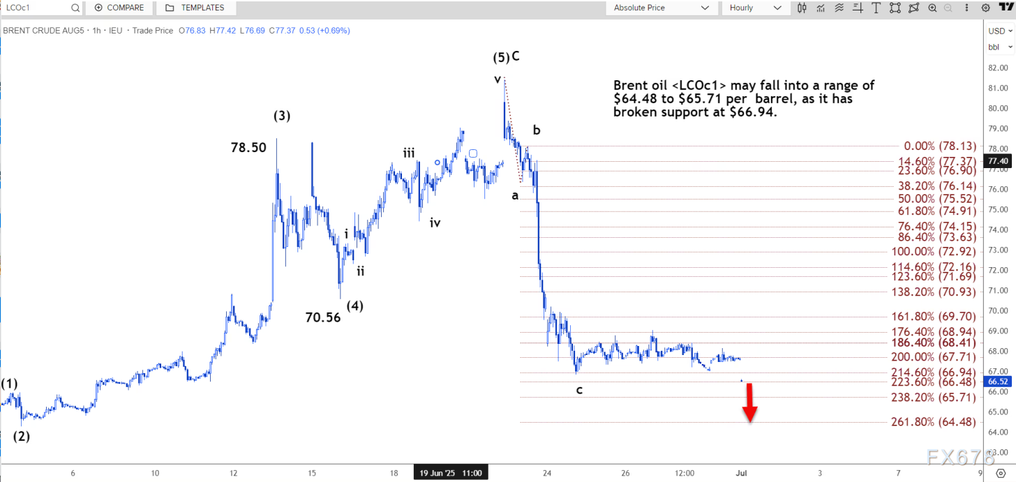 路透技术分析师指出,布伦特原油可能跌至每桶 64.48 美元至 65.71 美元的区间,因为它已经跌破了 66.94 美元的支撑位。