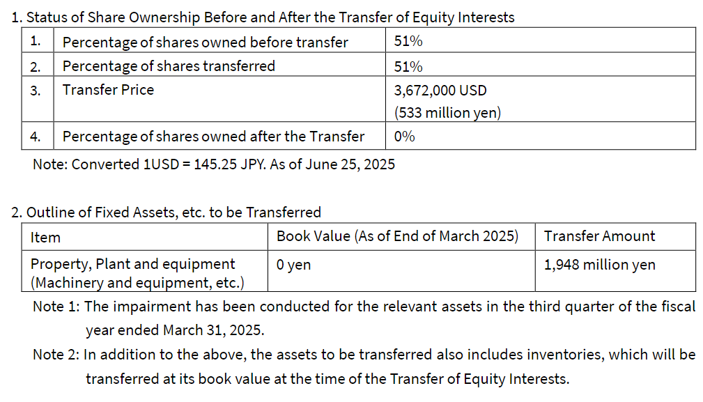 该交易价值约 24 亿日元(IT之家注:现汇率约合 1.19 亿元人民币),包含 SSTEC 股份及固定资产的转让。其中,SSTC 持有的 SSTEC 共 51%股权已在 6 月 30 日以 5.33 亿日元(现汇率约合 2647.9 万元人民币)的价格出售给 Fullertain,价值约 19 亿日元(现汇率约合 9439 万元人民币)的固定资产转让预计将于 2025 年 9 月底完成。