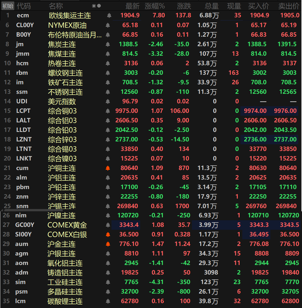 此外,碳酸锂主连涨0.16%,多晶硅主连跌2.39%,工业硅主连跌4.31%。欧线集运主连大涨7.8%。