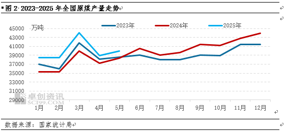国内产量方面,2025年上半年国内原煤产量整体保持同比增长趋势,据国家统计局数据,1-5月全国原煤产量达到19.9亿吨,同比增长6%,卓创资讯预计上半年全国原煤产量将在24亿吨左右,同比增速在5.9%。具体来看,一季度原煤产量同比增速呈现逐月加快趋势,增量主要由山西及新疆地区贡献,其中山西地区增量最为明显;进入二季度,随煤价重心明显下探,局部地区部分成本偏高的煤矿接近盈亏平衡线,出现阶段性暂停产销现象,国内原煤产量同比增速出现下滑,但仍保持正增长态势,产量维持在去年同期水平之上。