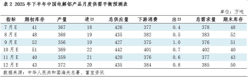 2025年下半年电解铝市场预计基本面延续良性预期,供需端延续紧平衡态势。就月度平衡来看,下半年库存或将延续近五年低位水平,预计三季度累库不及去年,延续五年同期低位水平,四季度季需求或季节性改善,供需格局延续紧凑状态。