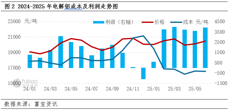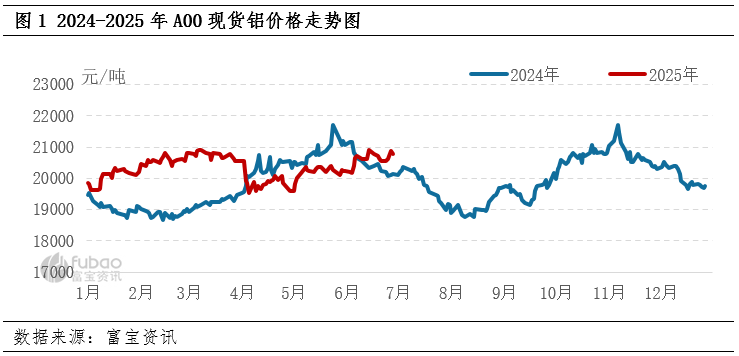 2025年良性的基本面格局使得上半年电解铝价格总体维持高区间状态。截至6月30日,2025年上半年A00现货铝均价为20312元/吨,较2024年同期上涨517元/吨,涨幅2.61%。