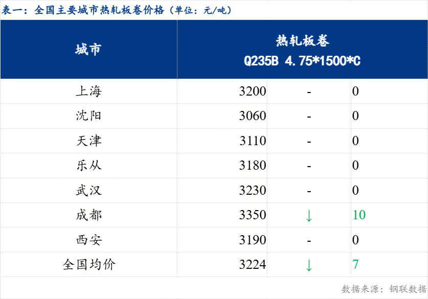 今日热轧板卷全国主要城市价格小幅下跌,截止发稿时3.0mm热轧板卷全国均价3283元/吨,较上一交易日下跌7元/吨;4.75mm热轧板卷全国均价3224元/吨,较上一交易日下跌7元/吨。分区域来看,今日各区域基本下行,下跌幅度在10-20元/吨左右。今日黑色商品期货延续弱势运行,10合约收涨0.06%,期货市场早盘小幅低开,部分市场现货价格小幅下跌,午后盘面震荡上行,尾盘收红,现货市场午后基本以稳为主,全日成交情况一般。