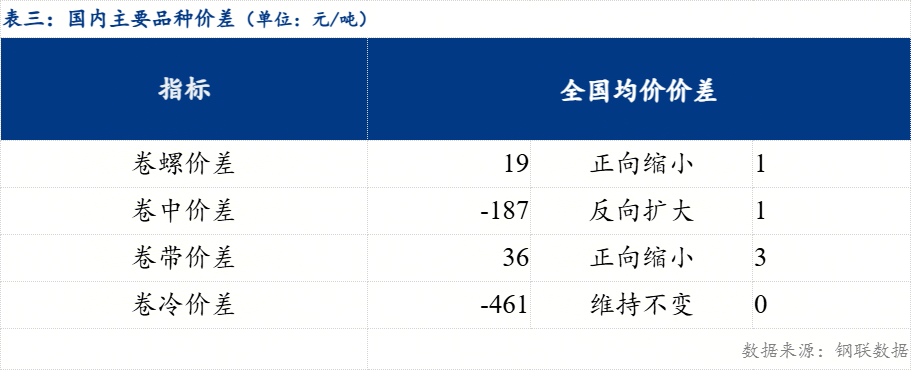 从品种价差来看,卷螺差较上一交易日正向缩小1元/吨,热中价差较上一交易日反向扩大1元/吨,热带价差较上一交易日正向缩小3元/吨,热冷价差较上一交易日维持不变。