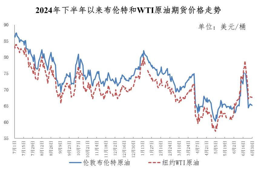 调价周期内,在以伊局势演变影响下,国际油价大幅震荡。以布伦特原油期货为例,价格先由每桶73美元左右上涨至近79美元,随后快速回落至68美元之下并平稳运行。一方面,以伊局势缓和、中东地缘政治风险下降主导油价从高位回落。市场普遍认为后续能源基础设施受袭、霍尔木兹海峡航运受阻的可能性较低,石油供应和运输将保持稳定。与此同时,石油供应过剩预期加剧。国际能源署6月预估,今年全球石油供应量增加180万桶/日,较前期预估上调20万桶/日,预计全年石油供应过剩约110万桶/日。“欧佩克+”也将于7月份连续第三个月增产。但另一方面,北半球石油需求季节性增长,原油库存处于低位为油价提供了一定支撑。据美国能源信息署预测,6—9月欧美石油需求将增加70万桶/日。截至6月20日,美国炼油厂开工率升至年内高点94.7%;商业原油库存连续五周下降至4.15亿桶,较五年均值水平低约11%。