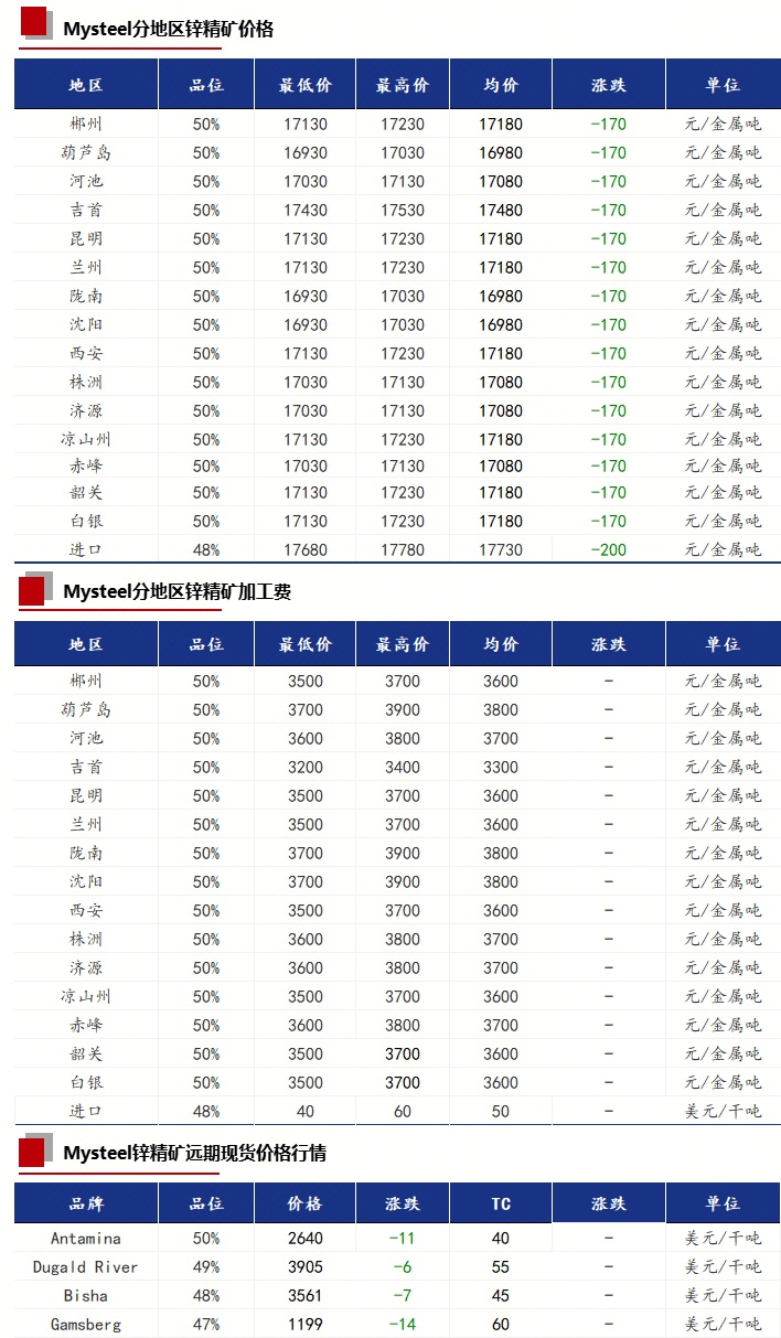 今日国内锌精矿加工费各地区未进行调整,均和上一交易日持平,受锌价的影响,锌精矿价格较昨日下跌170元/金属吨。进口锌精矿加工费目前市场报价在40-60美元/干吨,暂无变化。