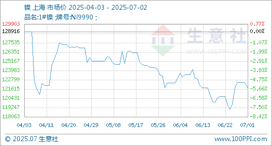 7月2日,生意社镍基准价为121700.00元/吨,与本月初(122400.00元/吨)相比,下降了0.57%。