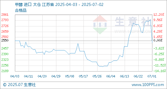 7月2日,生意社甲醇基准价为2530.00元/吨,与本月初(2805.00元/吨)相比,下降了9.8%。