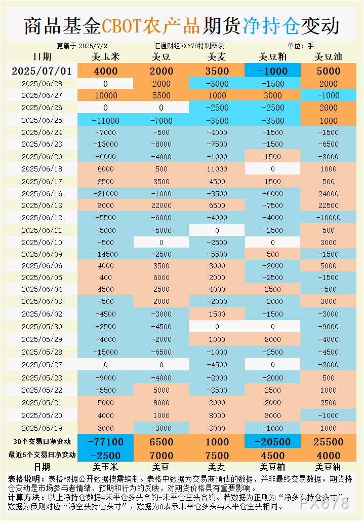 汇通财经APP讯——周三(7月2日),芝加哥期货交易所(CBOT)谷物市场在本周初呈现分化走势,交易者情绪在近期持仓变动和基本面消息影响下波动明显。7月1日,CBOT大豆期约微涨,豆油上涨提振市场,但豆粕因供应宽松承压下行;玉米期货因作物长势良好和供应预期充裕跌至合约低点;小麦则因逢低买盘支撑反弹至一周高位。持仓数据显示,商品基金在过去5个交易日对大豆、小麦、豆粕和豆油转为净多头,而玉米则转为净空头,反映市场对各品种前景的分歧预期。美国农业部(USDA)最新报告和天气预报进一步为市场提供指引,而国际交易动态和政策变化也对价格产生深远影响。本文将基于最新数据,剖析持仓变动、市场情绪及基本面对CBOT玉米、大豆、小麦、豆油和豆粕的影响,并展望未来走势。