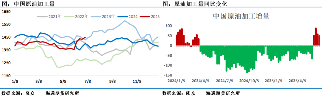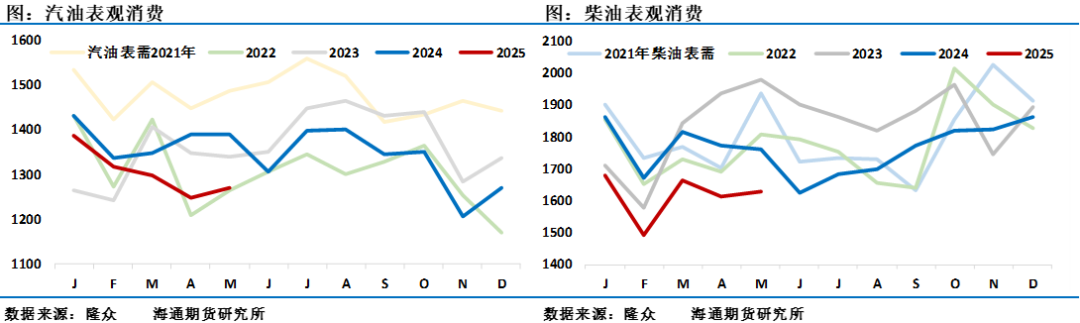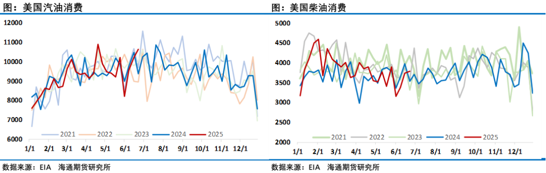 需求方面,上周美国原油表需有小幅下行,不过在传统消费旺季阶段,整体消费处于年内高位阶段,汽油消费表现较好,柴油消费平淡,整体来看美国原油需求明显低于年初预期,EIA最新展望中已经将美国原油需求下调到了增长8万桶/日的低速(年初预期的1/3)。中国原油加工量连续第四周反弹,连续三周高于去年同期加工量,但最近2周汽柴油产量几乎没有增长,原油加工增量主要去往了化工链条和航煤,成品油消费明显低于去年同期,这让炼厂不得不调整生产计划。
