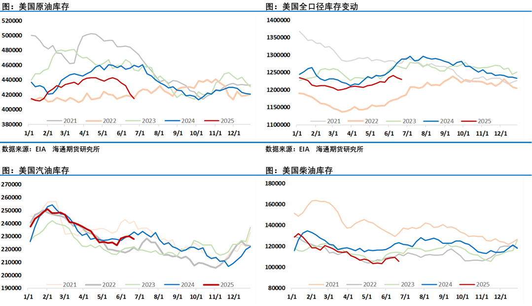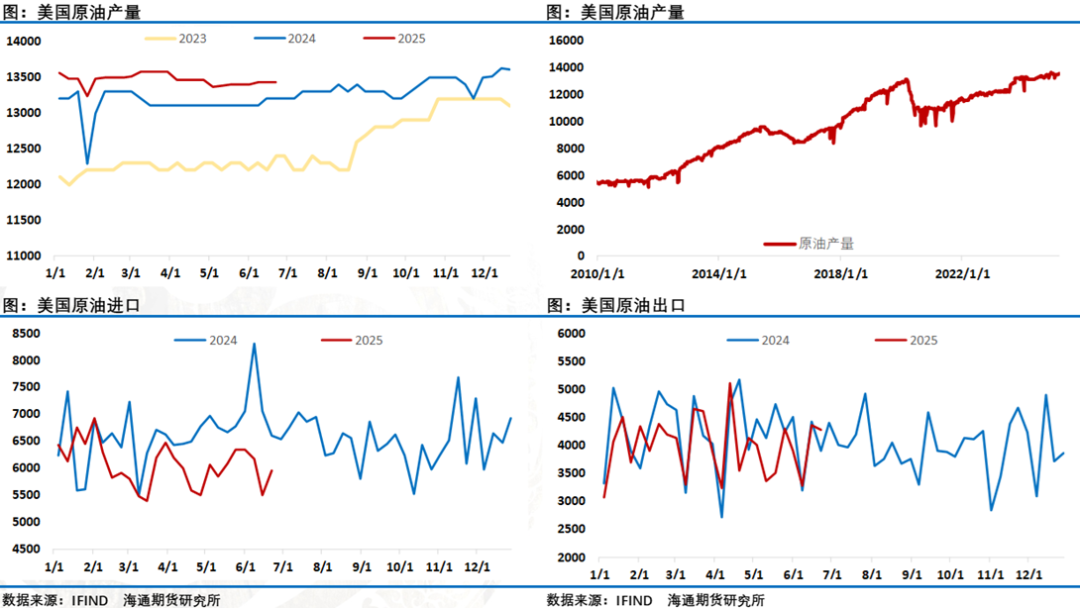 贝克休斯油服数据显示美国钻探公司连续第九周削减石油和天然气钻机数量。美国至6月27日当周石油钻井总数 432口,前值438口,钻机数的连续下降意味着美国原油产量增速将持续变缓。近期原油产量基本平稳,最新一期EIA周度报告显示美国原油产量在1343.50万桶/日;当周原油进口量环比增加44万桶/日,出口量环比减少9.1万桶/日,净进口量环比上升,不过相对来讲净进口量明显低于去年同期,这正是美国石油库存下降的主要原因。