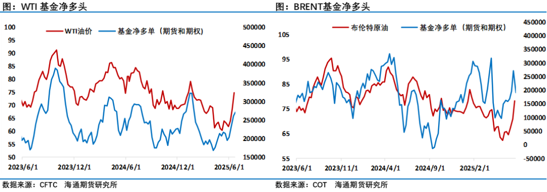 经历了周初的暴跌之后,过去的三个交易日油价维持了一个窄幅的横盘拉锯,显然市场需要一段时间来平复情绪,来对市场做重新评估。突然停火带来的急跌让众多市场参与者来不及应对,最新持仓变化显示WTI原油非商业持仓净多头寸继续增长,尤其是管理基金净多头寸截至6月24日其净多头寸仍然较上一期增长了超过1万手,达到273568手,显然急速的反转让众多做多地缘风险的资金来不及撤离。相比之下洲际交易所布伦特原油投机净多头头寸减少了80,577手,至192,598手。