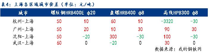 以主要品种螺纹钢来看,上海市场与杭州价差小幅扩大,价差为50元/吨。上海市场与东北区域价差小幅收窄,价差为50元/吨 。上海市场与华南区域价差小幅扩大,价差为50元/吨。上海市场与华中区域价差变化不大,价差为60元/吨。